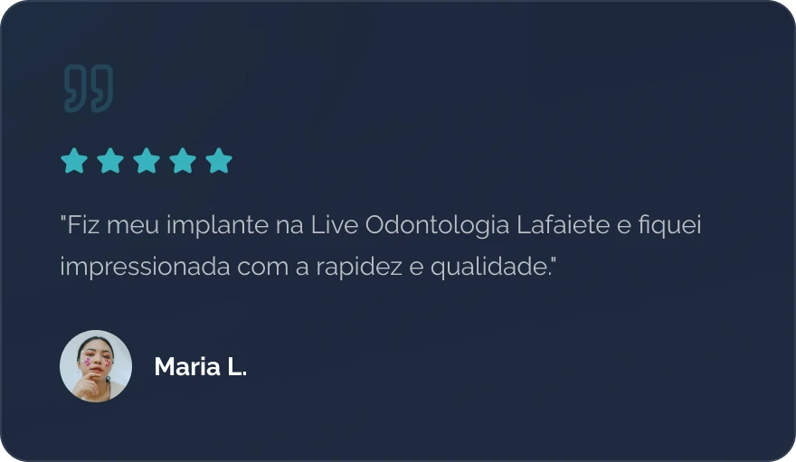 Na Live Odontologia, recuperamos seu sorriso e confiança com implantes dentários rápidos e aparelhos ortodônticos personalizados. Tratamentos modernos, atendimento humanizado e instalação de prótese em até 7 dias para casos indicados.